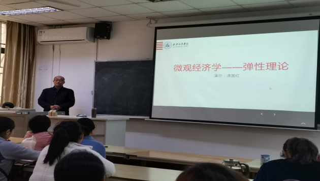 经济系教师韦艳宁通过讲授《微观经济学》课程中机会成本的内容,展示了她的混合式课堂教学设计。李英老师以《微观经济学》课程中价格歧视为例进行混合式教学设计展示。潘国红老师通过需求价格弹性理论的课程内容展示介绍了他的混合式教学设计。周晓燕老师展示了实操性较强的《电子商务》课程的混合式教学设计。